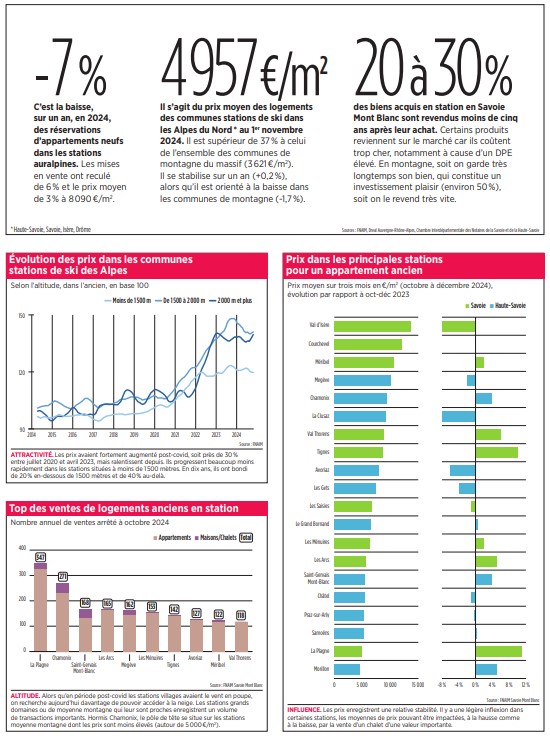 Dans son étude annuelle sur l’immobilier en montagne, qui analyse l’évolution des prix sur un an dans 370 stations de ski françaises au 1 er novembre, la Fédération nationale de l’immobilier (Fnaim) constate qu’ils ont baissé de 3 % sur les 18 derniers mois, après un bond de 28 % entre juillet 2020 et avril 2023. Dans les Alpes du Nord, et a fortiori en Savoie Mont Blanc, ils restent globalement stables (+0,2 %). Cette stabilité masque néanmoins de fortes disparités selon les secteurs géographiques. Pour Me Barbieri, président de la Chambre interdépartementale des notaires de Savoie et Haute-Savoie, des corrections tarifaires de l’ordre de 2 % sont bien intervenues en 2024 sur ce marché de niche, à rebours des tendances nationales. « Mais sur cinq ans, les prix ont augmenté de 20 % dans certaines zones », pointe le notaire de Chamonix, à l’appui de la dernière livraison de l’Observatoire immobilier des notaires (ADNOV). En 2024, en Tarentaise et dans les 3 Vallées, le prix médian au mètre carré dans l’ancien a grimpé respectivement de 8,5 % (6 240 €) et de 8,3 % (9 360 €). En Haute-Savoie, s’il s’est rétracté de 7 % dans les Aravis, il s’est stabilisé dans le Grand Massif (4 850 €) et les Alpes du Léman (2 720 €), mais s’est encore accru de 3,8 % sur le secteur Mont-Blanc (7 010 €).